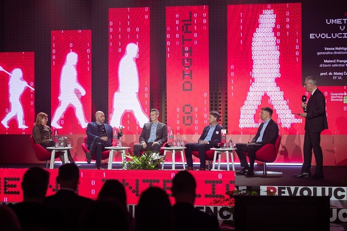 Na okrogli mizi o vprašanju, ali gre pri uporabi umetne inteligence v poslovanju za revolucijo ali evolucijo, so svoja razmišljanja predstavili generalna direktorica GZS Vesna Nahtigal, državni sekretar na Ministrstvu za gospodarstvo, turizem in šport Matevž Frangež, prof. dr. Matej Černe z Ekonomske fakultete Univerze v Ljubljani, predsednik iniciative AI4SI Mitja Trampuž ter izvršni direktor področja za digitalno poslovanje in izkušnjo stranke pri Zavarovalnici Triglav Gregor Kovačič.