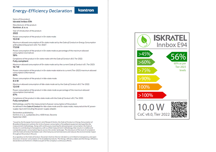 Izjave o energetski učinkovitosti dopolnjujejo oznake energetske učinkovitosti, ki jih je podjetje uvedlo leta 2022 – prvič v telekomunikacijski industriji. Te oznake navajajo porabo energije produkta in stopnjo skladnosti s kodeksom ravnanja EU. Kontron se zavezuje, da bo njegova oprema za širokopasovni dostop v skladu s strogimi omejitvami, ki jih Kodeks ravnanja EU določa za porabo energije, ter da bodo stranke in uporabnike jasno obveščali o porabi. Oznake in deklaracije so na voljo na spletni strani podjetja in so enostavne za branje in razumevanje.