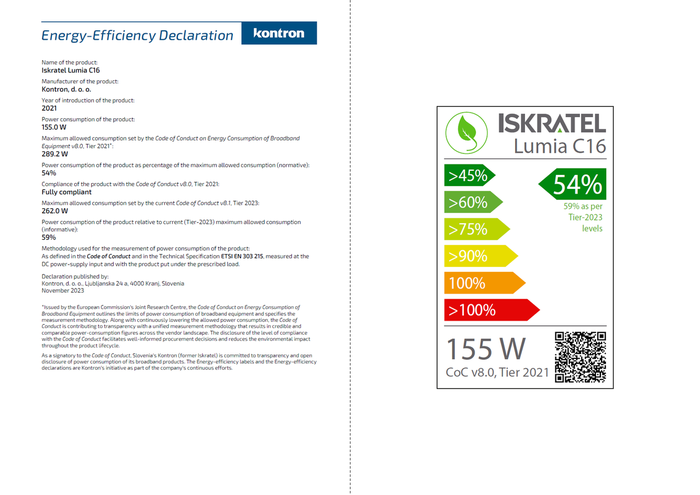 14. 12. 2023 - Stranke vodilnega evropskega ponudnika rešitev trajnostnega optičnega dostopa – Kontrona (prej imenovanega Iskratel) – lahko zahvaljujoč uvedbi deklaracij o energetski učinkovitosti novih širokopasovnih produktov sprejemajo bolj informirane odločitve o svojem vplivu na okolje. Javno dostopne deklaracije navajajo porabo energije produktov in metodologijo testiranja ter zagotavljajo verodostojne in primerljive številke glede na omejitve, navedene v Kodeksu ravnanja EU glede porabe energije širokopasovne opreme.