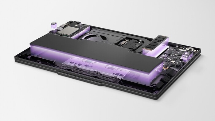 Ključni modularni elementi vključujejo snemljivo tipkovnico Bluetooth®, sekundarne zaslonske module in zamenljive vmesnike, vključno z USB Type-A, USB Type-C® in HDMI, kar omogoča prehod med kompaktno mobilnostjo in razširjeno produktivnostjo, hkrati pa ohranja stabilnost, varnost in zmogljivosti. Vgrajeni konektorji pogo-pin omogočajo zanesljiv prenos energije in podatkov med moduli, kar ustvarja samostojen, zelo prilagodljiv sistem, zasnovan za sodobne uporabnike prenosnih računalnikov, ki