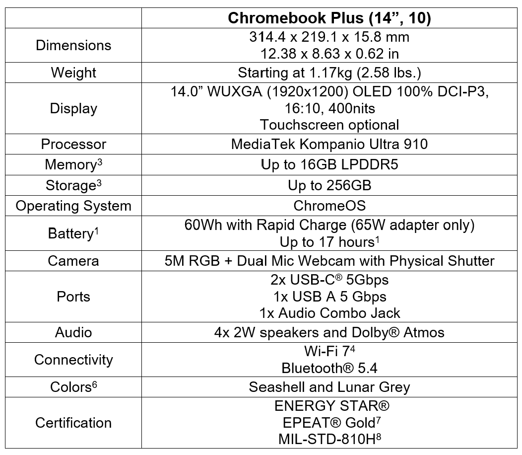 Lenovo Chromebook Plus (14", 10) je prvi Chromebook, ki ga poganja procesor MediaTek Kompanio Ultra, vodilni procesor z grafično sredico Arm Immortalis-G925 MC11 in NPE MediaTek 890. Lenovo Chromebook Plus (14", 10) s funkcijo Gemini, ki je kombinacija energetske učinkovitosti in zmogljivosti umetne inteligence, odpira nove načine dela, ustvarjanja in organiziranja ter z lahkoto prevzema najnovejše Googlove funkcije umetne inteligence, vključno z ekskluzivnimi funkcijami v napravi, kot sta