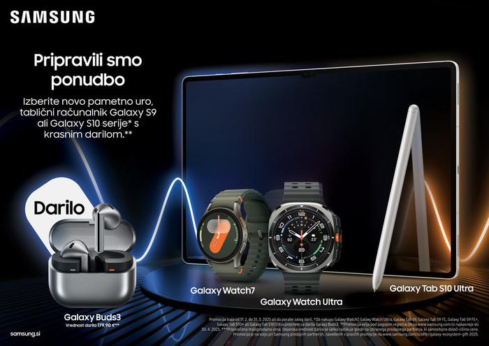 Kupci, ki bodo med 17. februarjem in 31. marcem 2025 kupili tablični računalnik Galaxy Tab S9, Galaxy Tab S9 FE, Galaxy Tab S9 FE+, Galaxy Tab S10+, Galaxy Tab S10 Ultra ali pametno uro Galaxy Watch7 ali Galaxy Watch Ultra, bodo prejeli brezžične slušalke Galaxy Buds3. Galaxy Buds3 zagotavljajo vrhunsko kakovost zvoka z aktivnim odpravljanjem šumov (ANC), brezhibno povezljivost z napravami Galaxy ter udobno prileganje za celodnevno nošenje, kar jih naredi popoln dodatek k ekosistemu