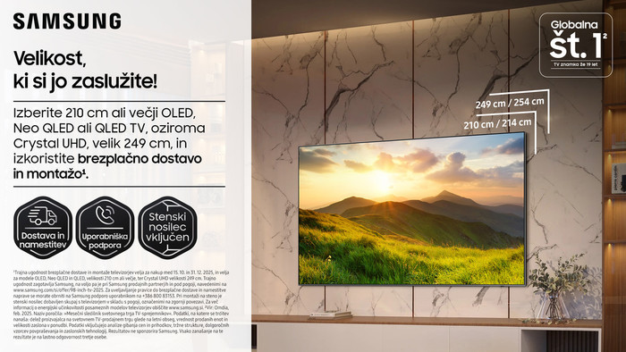 [6] Trajna ugodnost brezplačne dostave in montaže televizorjev velja za nakup med 15. 10. in 31. 12. 2025, in velja za modele OLED, Neo QLED in QLED, velikosti 210 cm ali večje, ter Crystal UHD velikosti 249 cm. Trajno ugodnost zagotavlja Samsung, na voljo pa je pri Samsung prodajnih partnerjih in pod pogoji, navedenimi na www.samsung.com/si/offer/98-inch-tv-2025. Za uveljavljanje pravice do brezplačne dostave in namestitve naprave se morate obrniti na Samsung podporo uporabnikom na +386 800