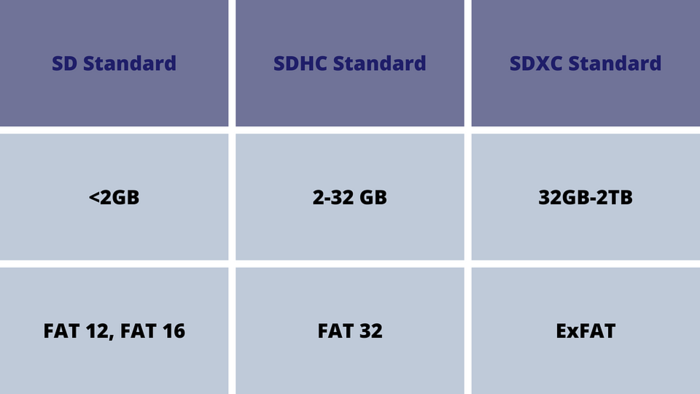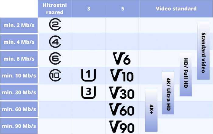 3. Razred UHS – določa najmanjšo hitrost zaporednega pisanja kartice. Dejanska hitrost je odvisna tudi od naprave, v kateri je kartica uporabljena. Spodnja preglednica prikazuje, katere kartice so primerne za snemanje videoposnetkov.