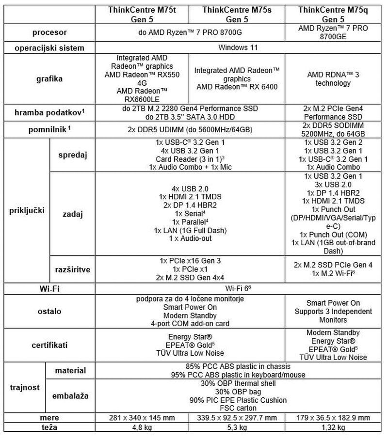 Ljubljana, 17. april 2024 – Lenovo™ je predstavil novo družino namiznih računalnikov ThinkCentre™, ki jih poganjajo procesorji AMD Ryzen™ PRO 8000 Series z do 16 TOPS (trilijonov operacij na sekundo) zmogljivosti integrirane NPE, namenjene obdelavi delovnih obremenitev z umetno inteligenco. Med njimi so izjemno zmogljivi ThinkCentre M75t Gen 5, prilagodljivi ThinkCentre M75s Gen 5 in kompaktni ThinkCentre M75q Gen 5. Družina namiznih računalnikov ThinkCentre M75 Gen 5, zasnovana za izpolnjevanje raznolikih potreb sodobnega poslovanja, izkorišča zmogljivosti umetne inteligence, hkrati pa optimizira svojo energetsko učinkovitost, da doseže impresivne rezultate.