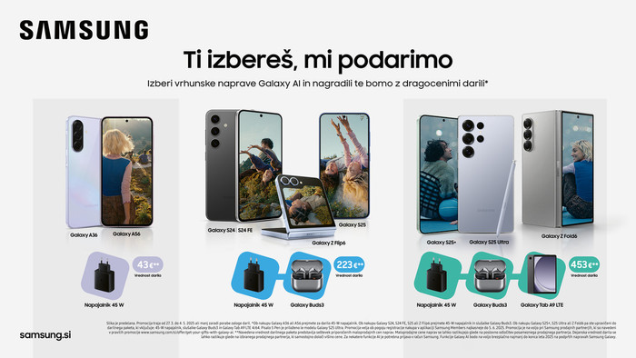 Samsung predstavlja Galaxy promocijo, ki bo potekala od 27. marca do 4. maja 2025 oziroma do razprodaje zalog. Kupci modelov Galaxy A36 ali A56 bodo prejeli 45 W napajalnik. Tisti, ki se bodo odločili za Galaxy S24, S24 FE, Z Flip6 ali S25, bodo poleg 45 W napajalnika prejeli še brezžične slušalke Galaxy Buds3. Medtem bodo kupci modelov Galaxy S25+, S25 Ultra ali Z Fold6 on napravi prejeli 45 W napajalnik, slušalke Galaxy Buds3 in tablični računalnik Galaxy Tab A9 LTE.