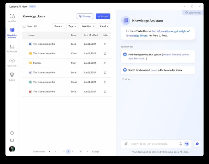 Lenovo AI Now vključuje tudi funkcionalnosti PC asistenta, ki uporabnikom omogočajo konfiguriranje naprav s pomočjo pozivov v naravnem jeziku. Uporabniki lahko na primer prilagodijo nastavitve, kot je svetlost zaslona, ali omogočijo orodja za produktivnost, kot je način za nego oči, in to tako, da preprosto vprašajo Lenovo AI Now. Z asistentom za znanje lahko uporabniki datoteke spustijo v svojo osebno bazo znanja, v njej iščejo in celo postavljajo specifična vprašanja za pridobitev ključnih vpogledov, zaradi česar je Lenovo AI Now zmogljivo orodje za organizacijo velikih količin podatkov. Poleg tega Lenovo AI Now spodbuja bogat ekosistem aplikacij umetne inteligence podjetja Lenovo in drugih ponudnikov, kar še dodatno širi zmogljivosti platforme za podporo pisarniškega dela, ustvarjalnih nalog in celo igranja iger (2). Tako strokovnjakom, študentom in ustvarjalcem omogoča uporabo orodij umetne inteligence, ki lahko povzemajo dokumente, pripravljajo osnutke odgovorov, ustvarjajo vizualne podobe in še veliko več – vse to ob omogočanju gladke in hitre izkušnje na lokalni napravi ter ob izkoriščanju zmogljivosti oblaka.