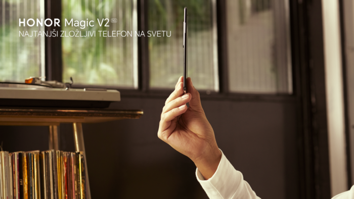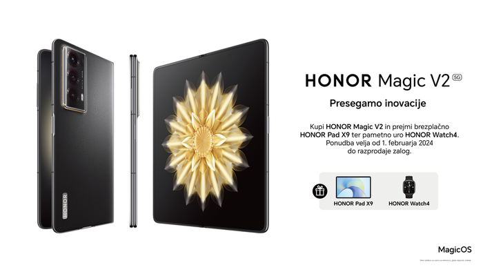 [Ljubljana, 2. februar 2024] HONOR-jev nov najtanjši preklopni telefon na svetu HONOR Magic V2, ki so ga za evropski trg premierno predstavili prejšnji teden v nemškem Leipzigu, je s 1. februarjem na prodaj tudi pri nas. Po priporočeni maloprodajni ceni 1999 evrov je na voljo pri vseh večjih mobilnih operaterjih A1, Telekom in Telemach v črni barvi PU in oblečen v vegansko usnje. Kupci telefona ob nakupu vse do razprodaje zalog prejmejo tudi tablico HONOR Pad X9 in pametno uro HONOR Watch 4.