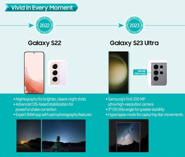 Nove generacije senzorjev so premaknile meje mogočega. Telefona Galaxy S22 in S23 Ultra sta prinesla napredno optično stabilizacijo, Galaxy S23 Ultra pa je uvedel prvi senzor z ultra visoko ločljivostjo 200 MP, s čimer je mobilno fotografijo dvignil na raven, ki je bila še pred nekaj leti nepredstavljiva.