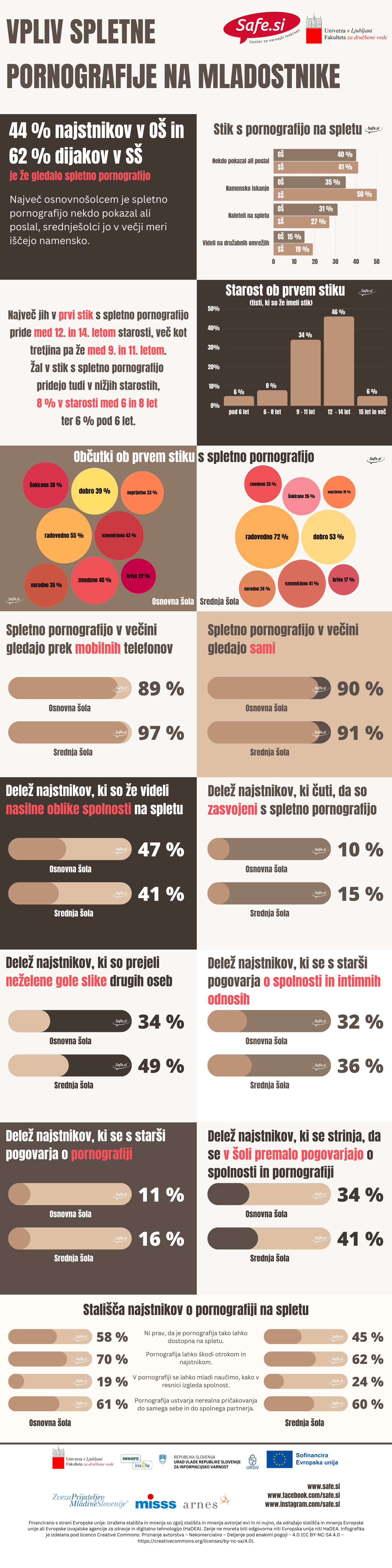 Petina osnovnošolcev in četrtina srednješolcev gleda pornografijo pogosto, občasno pa petina osnovnošolcev in tretjina srednješolcev. Med tistimi, ki gledajo pornografijo pogosto ali občasno, je kar 60 % takšnih, ki gledajo večkrat tedensko, in 25 % takšnih, ki gledajo enkrat tedensko. Zasvojeno s pornografijo se počuti 10 % osnovnošolcev in 15 % srednješolcev, ki pornografijo gledajo. Kar 14 % srednješolcev je povedalo, da potrebuje vedno bolj ekstremne oblike pornografije, da se zadovoljijo. Neprijetne občutke glede spolnosti (strah, odpor ipd.) ima 14 % osnovnošolcev in 8 % srednješolcev. Skoraj polovica osnovnošolskih najstnikov in dve petini srednješolcev, ki so se že srečali s pornografijo na spletu, je že videlo pornografske posnetke z nasilnimi oblikami spolnosti.
