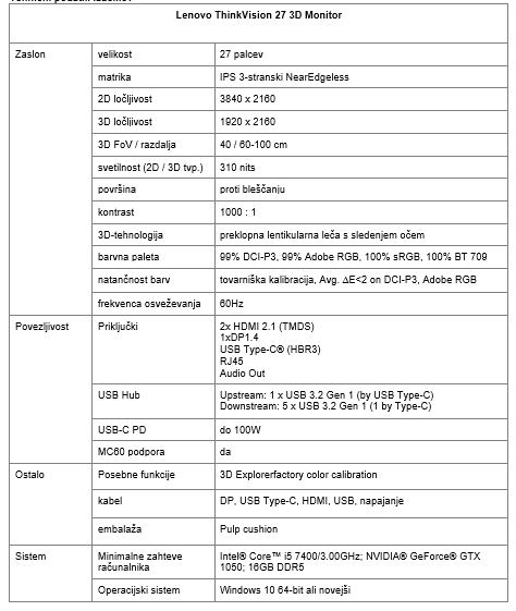 - Cena 3D-monitorja Lenovo ThinkVision 27 3D bo 2.999 evrov (z vključenim DDV), na izbranih trgih pa bo na voljo predvidoma od februarja 2024.