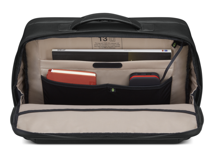 Izdelan je iz visokokakovostnih lahkih materialov, pri čemer je 70 % zunanjih materialov iz reciklirane embalaže (PET), in je zasnovan tako, da so prenosnik in dodatki varnejši in organizirani. Prostoren glavni predel in poseben oblazinjen predal sta primerna za prenosne računalnike do velikosti zaslona 16 palcev. Štirje dodatni žepi poskrbijo za organizacijo najnujnejših stvari, pametna reža za kabel pa omogoča polnjenje na poti (4), za lažji transport pa poskrbi potovalni trak za