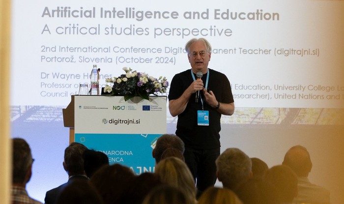 »Umetna inteligenca (UI) je dejstvo. In ne, da bo, ampak že korenito spreminja izobraževanje. Poraja se veliko etičnih in drugih vprašanj. Ali veste, kaj je še bolj nevarno od umetne inteligence? Naravna neumnost! Če želimo njeno nadzorovano uvajanje v izobraževanje, si je treba najprej postaviti cilj (ali bomo UI uporabljali za izboljšanje učnih rezultatov, za personalizacijo izobraževanja ali za administrativno podporo učitelju), potem z eksperimentalnimi projekti preskusiti njeno uporabo, jo evalvirati in dobre rešitve vpeljati v sistem. Med navedenim manjka še ena od ključnih točk uvajanja: izobraževanje strokovnih in vodstvenih delavcev VIZ za razumevanje ter varno in etično uporabo UI. In tu nastopi projekt Digitrajni učitelj. Ne le, da bo projekt opolnomočil učitelje, ampak bo v poznih letih tudi preprečil njihovo digitalno izključenost oz. digitalno revščino,« je pojasnil namestnik vodje projekta s ŠC Celje Denis Kač.