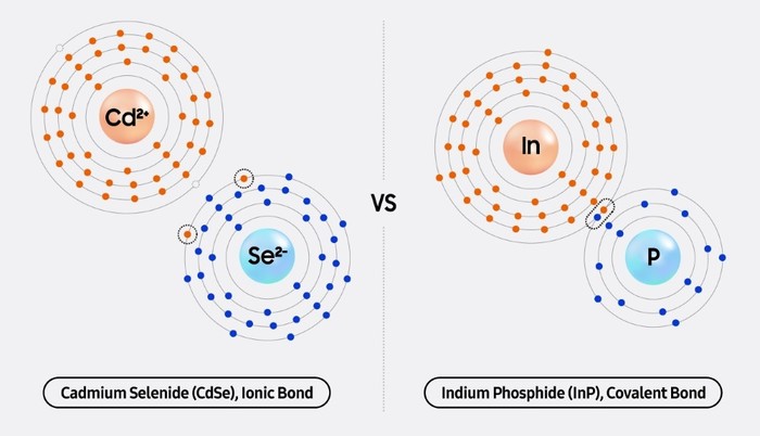 Kadmij, element z dvema valentnima elektronoma, tvori močne ionske vezi z elementi, kot so selen (Se), žveplo (S) in telur (Te), vsak od teh ima šest valentnih elektronov. Te kombinacije tvorijo stabilne polprevodnike, znane kot polprevodniki II–VI, materiale, ki so bili dolgo časa priljubljeni v raziskavah zaradi svoje sposobnosti tvorjenja visokokakovostnih nanokristalov tudi pri razmeroma nizkih temperaturah. Posledično je bila uporaba kadmija pri sintezi kvantnih pik dolga leta uveljavljen akademski standard. Nasprotno pa indij (In), alternativa kadmiju s tremi valentnimi elektroni, tvori kovalentne vezi z elementi, kot je fosfor (P), ki ima pet valentnih elektronov. Kovalentne vezi so na splošno manj stabilne od ionskih in so usmerjene po naravi, kar povečuje verjetnost napak med sintezo nanokristalov. Zaradi teh lastnosti je indij zahteven material za obdelavo, tako v raziskavah kot pri množični proizvodnji.