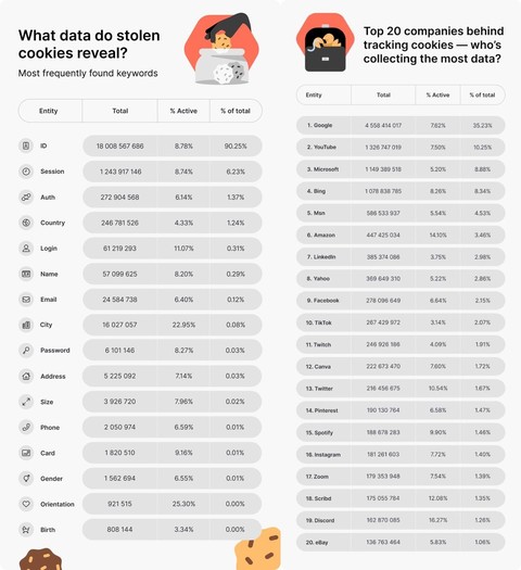 - Za krajo teh piškotkov je bilo uporabljenih 38 različnih vrst zlonamerne programske opreme, pri čemer je Redline z več kot 41,6 milijarde ukradenih piškotkov postal najaktivnejše orodje za krajo podatkov.