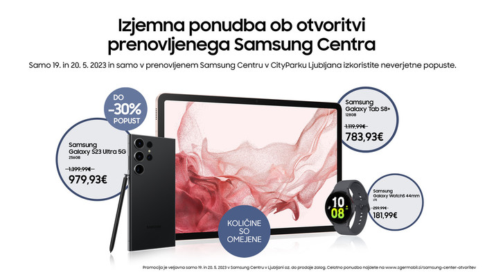 Podjetje Samsung Slovenija je v priljubljenem nakupovalnem središču City Park v Ljubljani odprlo prenovljeni Samsung Center. Ob otvoritvi, 19. in 20. maja, bodo izključno za obiskovalce trgovine na voljo številni popusti na izbrane izdelke. V izjemni ponudbi so pametni telefon Samsung Galaxy S23 Ultra, pametna ura Galaxy Watch5 in tablični računalnik Galaxy Tab S8+. Akciji pa se pridružujejo tudi pametni telefoni Galaxy A serije, druga dva telefona Galaxy S23 serije - Galaxy S23 in Galaxy S23+, tablični računalniki S8 serije in brezžične slušalke Galaxy Buds2.