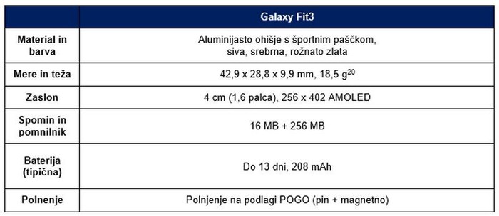 Galaxy Fit3 ima aluminijasto ohišje in 4-centimetrski (1,6-palčni) zaslon, ki je za 45 % širši od prejšnjega modela[2], zato lahko uporabniki z enim samim pogledom preverijo ključne podatke. Poleg tega je fitnes zapestnica lahka in elegantna ter se udobno prilega, zato je idealna za vsakodnevno uporabo 24 ur na dan. Uporabniki lahko Galaxy Fit3 zlahka vključijo v svoj življenjski slog zaradi dolgega trajanja baterije, ki lahko zdrži do 13 dni[3]. Svojo sledilno napravo lahko prilagodijo in jo
