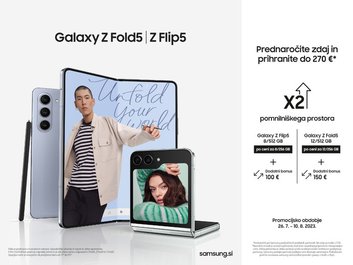 Galaxy Z Flip5 in Galaxy Z Fold5 sta od danes, 26. julija, na voljo za prednaročilo v Sloveniji pri pooblaščenih partnerjih Samsung. S prednaročilom pametnih telefonov Galaxy Z Flip5 in Galaxy Z Fold5 dobite odlične ugodnosti: več pomnilniškega prostora za ceno osnovne različice in dodaten bonus. Za vsa pravila in pogoje promocije obiščite povezavo. Galaxy Z Flip5 bo na voljo po priporočeni maloprodajni ceni od 1.199 EUR, Galaxy Z Fold5 pa po priporočeni maloprodajni ceni 1.899 EUR.
