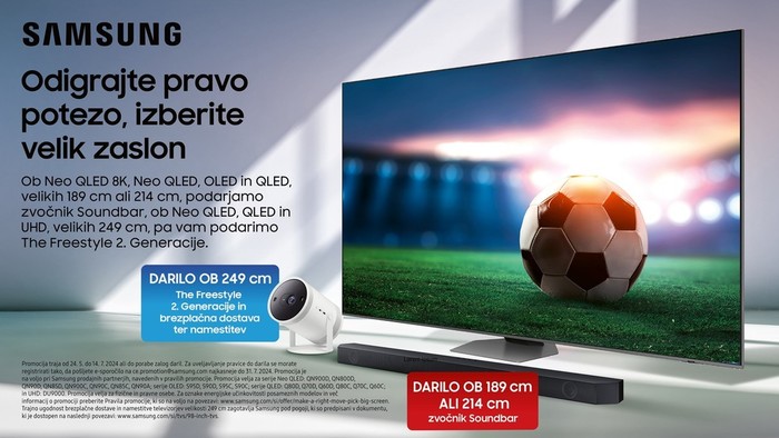 Ob nakupu televizorjev Neo QLED 8K, Neo QLED, OLED in QLED, velikih 189 cm ali 214 cm, vam podarjamo zvočnik Soundbar, ob Neo QLED, QLED in UHD, velikih 249 cm, pa vam podarimo prenosni projektor The Freestyle 2. generacije, skupaj z brezplačno dostavo in montažo. Promocija velja za serije Neo QLED: QN900D, QN800D, QN90D, QN85D, QN900C, QN90C, QN85C, QN90A; serije OLED: S95D, S90D, S95C, S90C; serije QLED: Q80D, Q70D, Q60D, Q80C, Q70C, Q60C; in UHD: DU9000. Celotna promocijska ponudba in