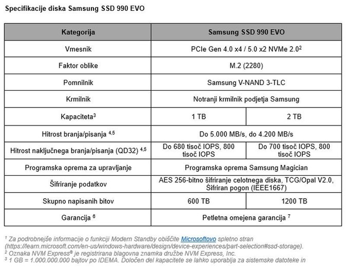 združljivost, toplotni nadzor in prihranek energije v prihajajočih uporabah. Disk 990 EVO je na voljo s kapaciteto 1 terabajt (TB) ali 2 TB.