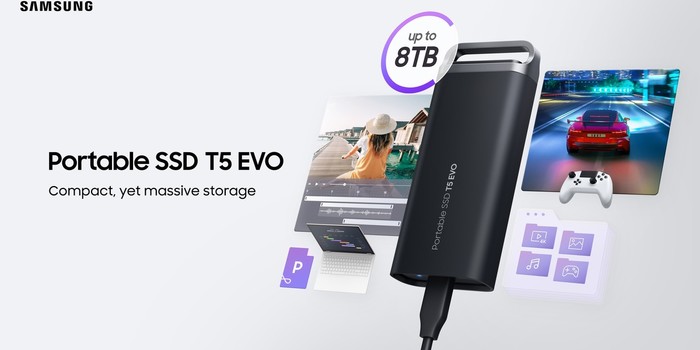 SEUL, Koreja – 14. november 2023 – Samsung Electronics Co., Ltd., vodilni svetovni ponudnik napredne polprevodniške tehnologije, je danes predstavil T5 EVO, lahek prenosni trdi pogon (Solid-State Drive - SSD), ki zagotavlja do 8 terabajtov (TB) kapacitete, kar je največja kapaciteta, ki jo ponujajo prenosni diski SSD, ki so trenutno na voljo na trgu. Skupaj s svojo kapaciteto T5 EVO zagotavlja izjemno visoke hitrosti v kompaktni, vzdržljivi zasnovi kot vrhunska, vsestranska rešitev diska SSD.