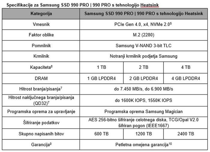 4-TB modela 990 PRO in 990 PRO s tehnologijo Heatsink bosta na voljo v začetku oktobra 2023. Modeli serije 990 PRO z 1 TB in 2 TB so trenutno na voljo za nakup. Za več informacij, vključno s podrobnostmi o garanciji, obiščite samsung.com/SSD ali semiconductor.samsung.com/internal-ssd/.