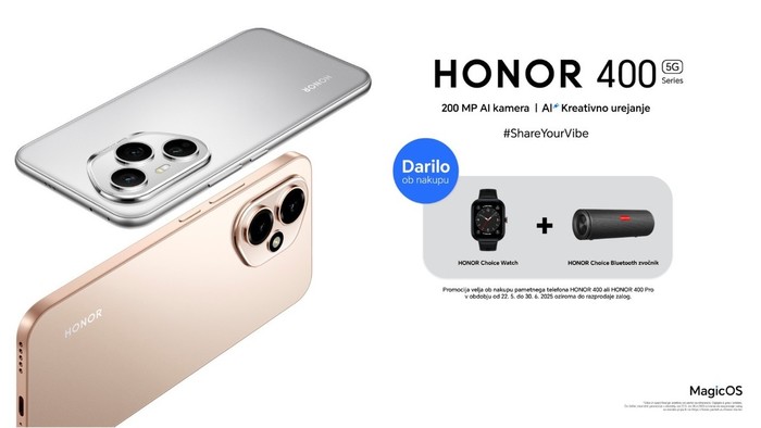 Z elegantnim dizajnom, navdihnjenim z naravo, je HONOR 400 v različici s pomnilnikom 8 GB + 512 GB na voljo v polnočno črni in zlati barvi, po maloprodajni ceni 549 EUR. HONOR 400 Pro pa je na voljo v različicah s pomnilnikom 12 GB + 512 GB, v odtenkih polnočno črne in mesečevo sive barve po maloprodajni ceni 799 EUR. Od 22. maja do 30. junija 2025 pri pooblaščenih prodajnih partnerjih HONOR poteka posebna promocijska ponudba: ob nakupu pametnega telefona HONOR 400 ali HONOR 400 Pro prejmete darilo – HONOR Choice uro in HONOR Choice Bluetooth zvočnik.
