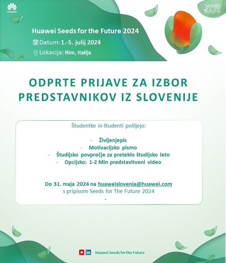 Regionalni dogodek Seeds for the Future bo med 1. in 5. julijem 2024 potekal v Rimu, nanj pa se bodo uvrstile tri študentke oz. študenti, ki bodo s svojo prijavo najbolj prepričali strokovno komisijo. Program v Rimu bo udeležencem ponudil pester nabor predavanj, delavnic, projektnega dela in seveda druženja. Udeleženci pa bodo vključeni tudi v globalni alumni klub Seeds for The Future.