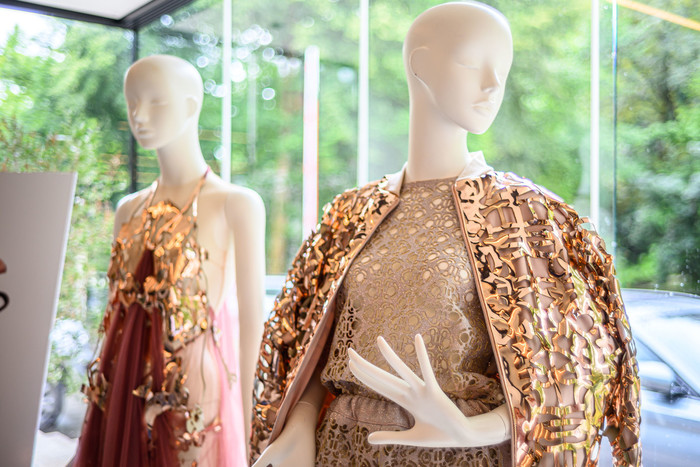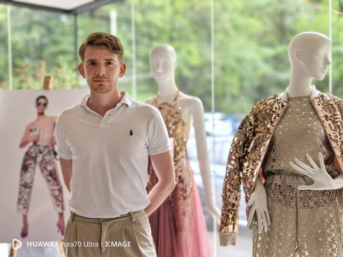 Matic Veler, oblikovalec: Od nekdaj me navdihuje tehnologija v modi. Cenim krojaško obrt in natančnost, to imam zapisano v genih, od vsakega izdelka pričakujem tehnično dovršenost. Lasersko izrezovanje je zadnja leta tehnika, ki jo uporabljam za doseganje posebnih učinkov 3D oblikovanja. Postavitev fotografskih leč na telefonu Pura 70 Ultra mi je z modeliranjem omogočila izdelavo zelo izbranega vzorca, ki na rahlo svetlečem blagu, ki sem ga izbral, pričara hkrati bogato, a zelo elegantno postavitev oblačila. Matic Veler se je po magistrskem študiju v Londonu uril pri nizozemski mojstrici nenavadnih oblik Iris Von Harpen, in kot zanimivost lahko dodamo, da je Iris za Huawei leta 2022 na seriji telefonov Huawei P50 oblikovala videz zadnje strani telefona.