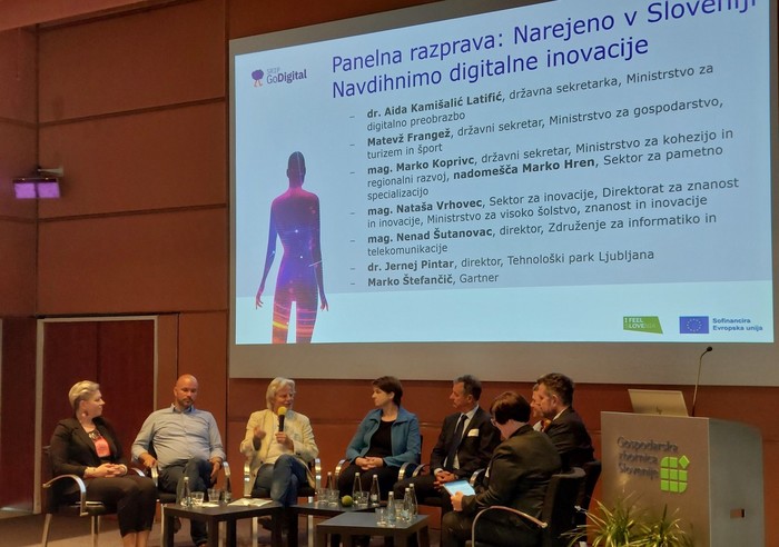 Marko Štefančič je v nadaljevanju predstavil pogled Gartnerja na trende, ki poganjajo jutrišnje inovacije. Letošnje leto je označil kot leto generativne umetne inteligence. Na panelni razpravi predstavnikov inovacijskega ekosistema in oblikovalcev politik, ki je sledila, so svoja stališča prikazali dr. Aida Kamišalić Latifić (MDP), Matevž Frangež (MGTŠ), mag. Nataša Vrhovec (Sektor za inovacije, Direktorat za znanost in inovacije MVŠZI), Marko Hren (MKRR), mag. Nenad Šutanovac (Združenje za informatiko in telekomunikacije na GZS), Jernej Pintar (Tehnološki park Ljubljana) ter Marko Štefančič (Gartner). Po besedah dr. Aide Kamišalić Latifić je njihovo ministrstvo horizontalno, so »skrbnik nacionalnega programa za umetno inteligenco«, na področju digitalizacije pa se trudijo za oblikovanje usklajenih ukrepov v sodelovanju z drugimi ministrstvi.