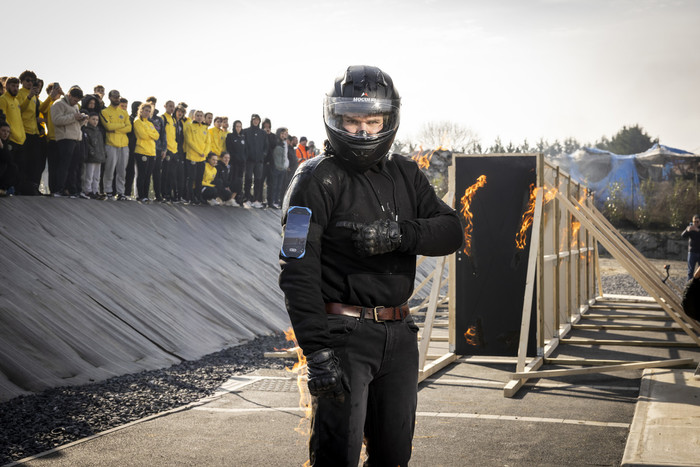 Kaskader Renaud Favero iz CUC je brez strahu pretekel šest zaporednih gorečih vrat, medtem ko je bil tudi sam v plamenih, ter izziv premagal v manj kot sedmih sekundah. Vsaka goreča ovira, velika 210 cm × 90 cm × 4 cm in oddaljena dva metra, je bila zahteven preizkus. Z le petimi sekundami za prehod vsakega od vrat je bila Faverojeva natančnost, hitrost in vzdržljivost potisnjena do skrajnih meja.