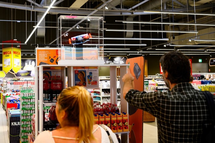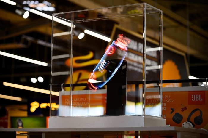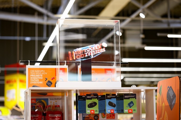 Ljubljana, 6. avgust 2024 - V petek, 2. avgusta, so v trgovini Interspar Citypark namestili manjši hologram zaslon ob stojalo, kjer je predstavljena akcijska ponudba točk zvestobe. V tokratni akciji so zvočniki in slušalke priznane blagovne znamke JBL, ki je znana po svojih visokokakovostnih avdio izdelkih.