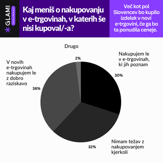 Slovenski potrošniki kažejo različne pristope, ko gre za nakupovanje v novih e-trgovinah. Po raziskavi modne platforme GLAMI.si 30 % anketirancev prve nakupe raje opravi izključno v znanih e-trgovinah ali tistih, ki jim jih priporočajo bližnji. Ta skupina kupcev išče varnost in zaupanje pred novim nakupom.