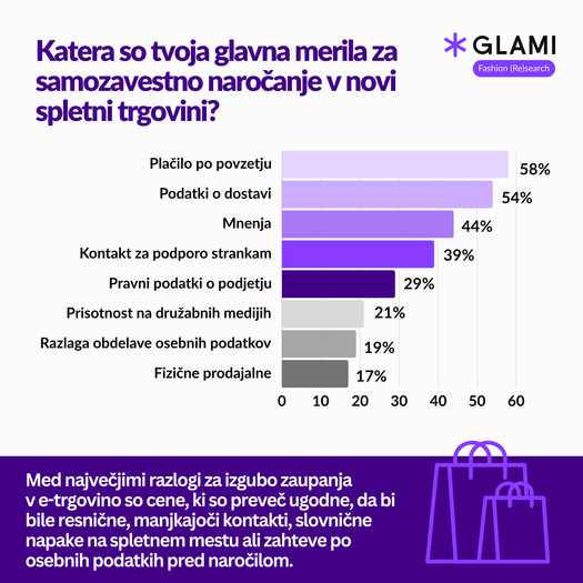 Modna platforma GLAMI.si je maja izvedla raziskavo o varnosti spletnega nakupovanja na vzorcu 1.231 anketirancev, da bi ugotovila, kako spletni kupci skrbijo za svojo varnost, kako se lotevajo novih e-trgovin, kaj jih motivira pri zvestobi in kateri so glavni dejavniki zaupanja in pomisleki glede varnosti spletnih trgovin. Raziskava je vključevala konkretne podatke o nakupnih odločitvah in navadah Slovencev.
