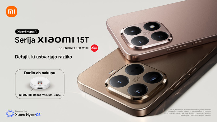 Xiaomi 15T Pro je na voljo v treh barvah: črni, sivi in Mochi gold ter v različici pomnilnika 12+512GB, cena pa je 899 EUR. Xiaomi 15T je na voljo v treh barvah: črni, sivi in zlati Rose, in v dveh različicah pomnilnika: Xiaomi 15T 12+512GB po ceni 699 EUR in 12+256GB po ceni 649 EUR. V obdobju od 24. 9. do 31. 10. ob nakupu naprav Xiaomi 15T Pro ali Xiaomi 15T prejmete v dar Xiaomi Robot Vacuum S40C – pametni robotski sesalnik.