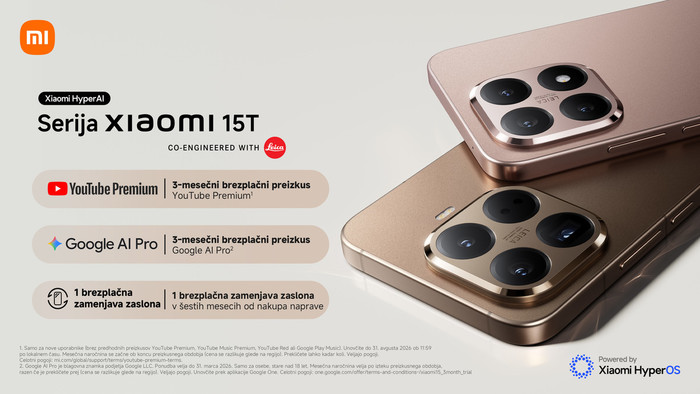 Ob nakupu serije Xiaomi 15T prejmete posebne ugodnosti – tri mesece brezplačne uporabe YouTube Premiuma, tri mesece Google AI Pro storitve ter eno brezplačno menjavo zaslona v šestih mesecih od nakupa naprave.