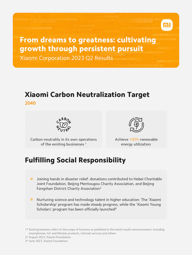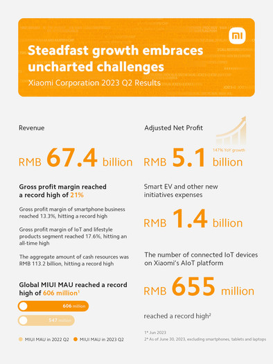 Xiaomi, podjetje za potrošniško elektroniko in pametno proizvodnjo, katerega jedro so pametni telefoni in pametne naprave, povezana s platformo interneta stvari (IoT), je objavilo nerevidirane konsolidirane rezultate za tri mesece, ki so se končali 30. junija 2023 (drugo četrtletje 2023). Odkar je pred dvema četrtletjema začela izvajati ključno strategijo podjetja "dvojni poudarek na obsegu in dobičkonosnosti", je Xiaomi dosegel močno rast dobička in poslovanja, pri čemer je več kazalnikov poslovanja doseglo rekordno visoke vrednosti. V drugem četrtletju leta 2023 so skupni prihodki dosegli 67,4 milijarde CNY, kar pomeni 13,2-odstotno rast glede na četrtletje (QoQ). Prilagojeni čisti dobiček je dosegel 5,1 milijarde CNY, kar pomeni 147-odstotno medletno rast. To pomeni najvišji četrtletni dobiček od četrtega četrtletja leta 2021, kar močno presega tržno soglasje. V prvi polovici leta 2023 je prilagojeni čisti dobiček dosegel 8,4 milijarde CNY in se tako približal ravni lanskega prilagojenega čistega dobička.