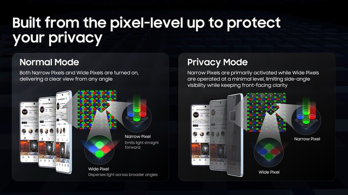 Zaslon za zasebnost na Galaxy S26 Ultra, ki je integriran neposredno v strojno opremo zaslona, nadzoruje način, kako slikovne pike zaslona razpršujejo svetlobo. Ko je vklopljen, omejuje vidljivost iz stranskih kotov, ko je izklopljen pa ohranja popolno izkušnjo zaslona iz katere koli smeri.