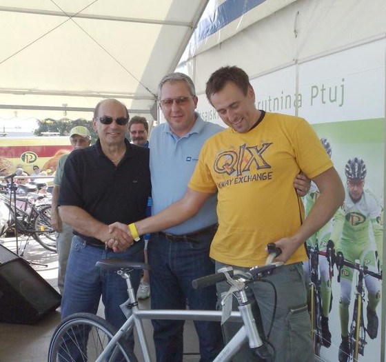 Pripis k fotografiji: Podelitev najprestižnejše nagrade 6. Poli maratona kolo Mercedes-Benz. Z leve proti desni: dr. Roman Glaser precednik uprave in direktor Perutnine Ptuj, g. Štefan Vöröš direktor Autocommerca in nagrajenec g. Boštjan Skok.