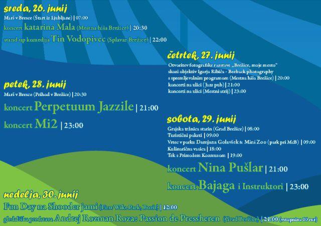 Seveda pa v nadaljevanju tedna pričakujemo še veliko spektakularnih dogodkov. Poleg izjemnih in brezplačnih koncertov katarine Male, Perpetuum Jazzile, MI2, Nine Pušler in Bajage i Optimistov nas čaka tudi tekaška preizkušnja s Primožem Kozmusom, za smeh bosta skrbela Tin Vodopivec in Andrej Rozman Roza, brežiške ulice bodo zaznamovane s fotografijami Igorja Ribiča, v nedeljo pa bomo sončno vreme izkoristili na dogodku Fun Day na Shooder Jami na Borštu.