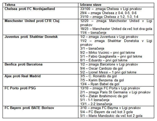 V eni izmed najtežjih prihajajočih tekem se bo FC Porto (13/10) soočil z ekipo zvezdnikov Paris St-Germain (2/1). Porto ima fantastičen seznam domačih dosežkov, vendar bodo morali biti v vrhunski pripravljenosti, da bi konkurirali parižanom. PSG se lahko pohvali z nekaterimi izmed najboljših napadalcev v svetovnem nogometu, vendar bodo brez poškodovanega Thiaga Motta, ki je obrambni sredinski igralec. Zlatan Ibrahimović ima razmerje 6/5 na strel kadarkoli, toda z oslabljeno obrambno linijo je možno tudi izenačenje. 1:1 je 5/1, izenačenjem 2:2 pa 13/1.