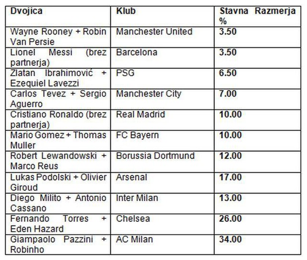 Z le 250 goli razlike v Ligi prvakov sta napdalca Robin Van Persie in Wayne Rooney, dinamična dvojica angleškega velikana Manchester United, s stavnim razmerjem 3.50, favorita v evropskih dvojicah napadalcev. V minuli sezoni Lige prvakov sta napadalca dosegla 57 golov v skupnem seštevku. Bosta takšno številko dosegla tudi letos ali jim bodo poškodbe preprečila načrte?
