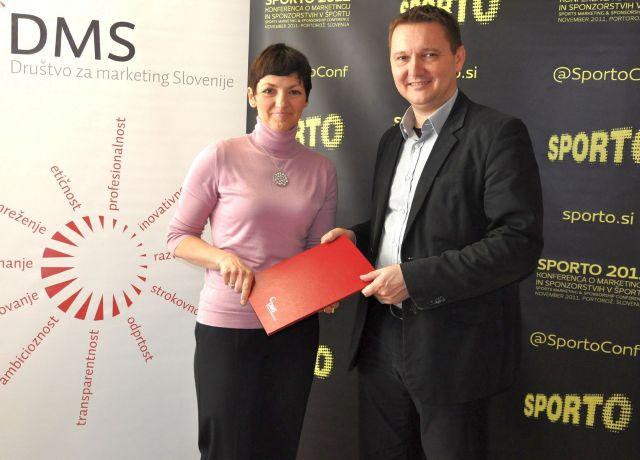 1. SPORTO nagrado 2012 letos prvič podeljuje Društvo za marketing Slovenije (z leve proti desni: Maja Makovec Brenčič, Ekonomska fakulteta in DMS ter Tomaž Ambrožič, SV-RSA)