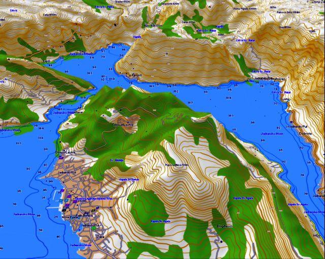 Prva fotografija: BASECAMP – 3D POGLED – VELIKO TOPOGRAFSKIH PODROBNOSTI S PLASTNICAMI, GORSKIMI VRHOVI, PORAŠČENOSTJO POVRŠIN, IZOBATAMI IN GLOBINAMI