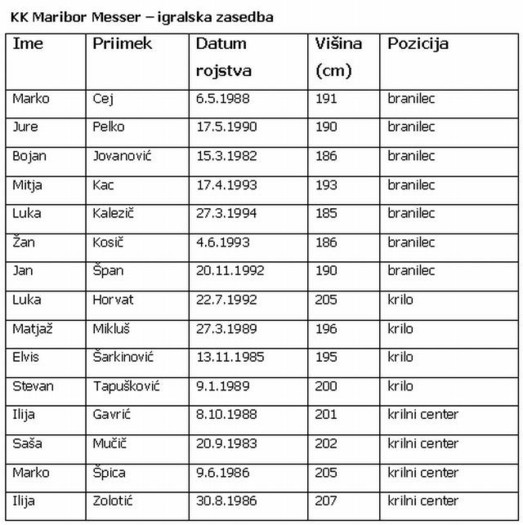 »Letos imamo bolj ali manj novo ekipo, saj je od lanskih igralcev ostalo le pet. Veseli dejstvo, da so z nami ostali vsi trije nosilci igre Ilija Zolotić, Bojan Jovanović in Saša Mučič. Tem trem pa smo dodali še mlade in igre željne mladeniče, ki bodo imeli priložnost pokazati svoje znanje in poskrbeti za marsikatero presenečenje,« je povedal športni direktor Jure Petić. Povprečna starost ekipe KK Maribor Messer je nekaj več kot 21 let, kar jo uvršča med eno najmlajših ekip v letošnji Ligi