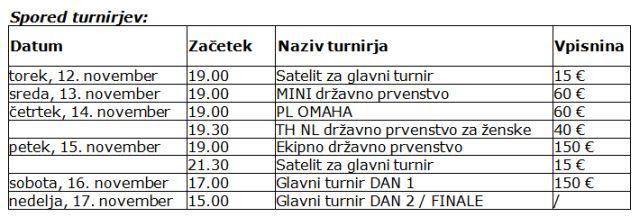 Po lanskem državnem prvenstvu, ki ga je gostil igralniško-zabaviščni center Mond v Šentilju, se bodo letos najboljši slovenski igralci pokra pomerili v igralniško-zabaviščnem centru Korona v Kranjski Gori. Koledar dogodkov je zelo pester, uradno pa se državno prvenstvo pričenja v sredo, 13. novembra, s turnirjem TH NL MINI državno prvenstvo, na katerem organizatorji pričakujejo okoli 100 igralcev. V četrtek, 14. novembra, se bodo igralci pomerili na turnirju PL Omaha, sledil bo zelo zanimiv