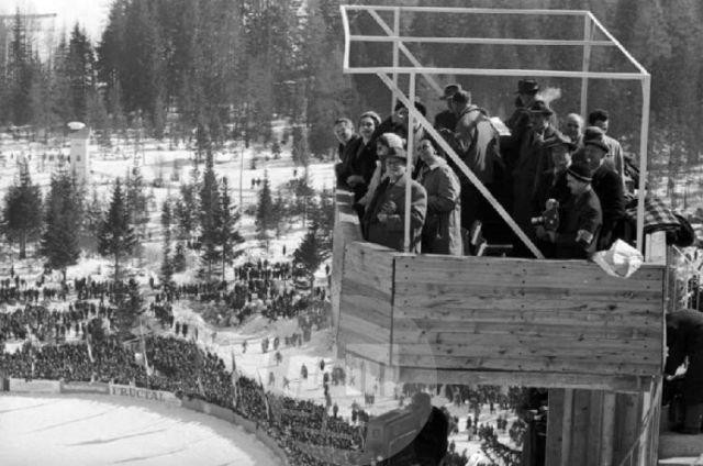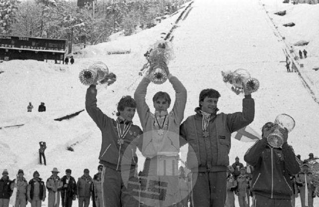 v smučarskih poletih v Planici iz let 1972, 1979 in 1985, smučarske skakalce in trenerje, sodnike, razne funkcionarje iz sveta smučarskih skokov, politike, planiške delavce in obiskovalce.