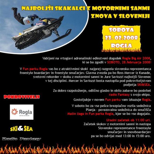 Uradni začetek ob 11:00 uri. Začetek skokov z motornimi sanmi in nastopa Sloveske reprezentance freestyle smučarjev in snowboardarjev pa se bo odvijal med 13:00 in 15:00 uro.