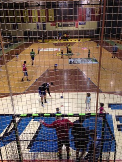 Iz pisarn smo otroke poslali na parket, kjer so si ogledali zadnje minute treninga članske ekipe, nato pa so se sami za nekaj časa prelevili v prave rokometaše. Vsak je dobil svojega spremljevalca, s katerim je pričel svojo rokometno avanturo.
