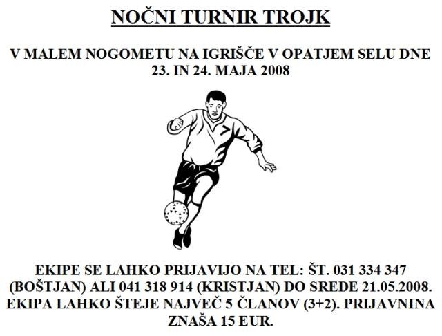 - petek 23.05.2008 - začetek turnirja ob 18. uri. V uvodni tekmi se bodo predstavili veterani ŠD Kras Opatje selo;